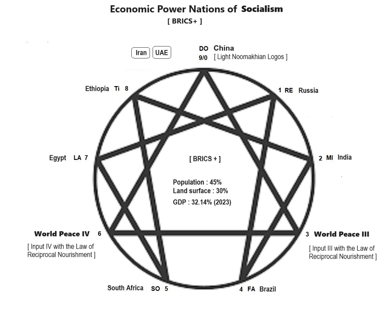 First, there is a FA-Historical Sociocosmic Species of Capitalism; then something emerges from its TI-DO Interval known as the Socialistic Will, and it is infantile socialism eating its way into the MI-FA Interval. The struggle begins in vertical contradictory unity in the polar FA-SO-LA-TI Historical Sociocosmic Periods of Capitalism and Socialism - ascending and descending in oscillation between socialistic essence and capitalistic essence leading finally to a complete material and objective split and separation of the FA-Historical Sociocosmic Species of Capitalism and the SO-Historical Sociocosmic Species of Socialism. The two historical sociocosmic species continue to reproduce and struggle for dominance horizontally within each of the 7 main civilizations, and across one civilization and another until the socialistic-essenced species becomes the dominant species in lead. The latest result of my objective observation, study and conclusion of this reality regarding this polar FA-SO-LA-TI Historical Periods of Capitalism and Socialism is that the infantile socialistic Will of the Sociotechnocosmos at the TI-DO Interval has taken root through the 3rd Mi-stopinder called BRIC which was established in year 2009 with four initial Global South countries - Brazil, Russia, India and China - and in 2010 South Africa joined in to become BRICS, and by 2024, six more countries have joined and it becomes BRICS(+) with some 30 more YAFEILA countries still on the waiting list. The countries and their orignal civilizations are all from YAFEILA World-Island extended. This new infantile Sociotechnocosmic Will (of socialism) of the TI-DO Interval struggles hard within the dying old Sociotechnocosmic Will of capitalism from the Group of Seven (G7) Global North countries dwelling mostly on the Outer Islands Crescent of the Presente. These countries are United States, Canada, United Kingdom and Japan from the Outer Islands Crescent with the exception of Germany, France and Italy from Europe, a part of World-Island. They are losing their dominance on a daily basis. The transformation of the existing enneagram of the FA-Historical Sociocosmic Species of Capitalism into the emerging and new enneagram of the SO-Historical Sociocosmic Species of Socialism is expected to be on full swing from now.