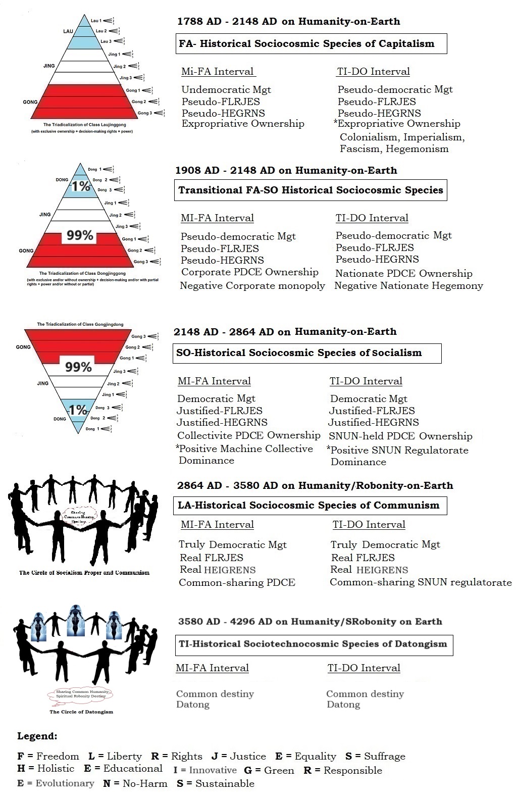 antagonistic. "Collective International Law and Order, an 'L'-design and construct of the PESTLES(+), made by the LA-Lau beings of the sixth-level stopinders 'LA' such as those made by the LA-stopinder US Hegemon of the FA-Historical Sociocosmic Species of Capitalism or the fourth historical specie-stopinder after World War II is just a partial historical passover-making for Humanity-at-Large (HAL) from 1533 AD through 2148 AD, and is a mere narrow-mindedly infantile (still a capitalistic-essenced extraction, exploitation and oppression) as compared to the emerging higher collective International Law and Order of the seventh-level stopinders 'TI' that will gradually be perfected as the World-of-Nations (TI) matures, and traversing the TI-DO Interval to complete NOO, PESTLES(+), PDCE and Carriages perfection at the 'DO' for the next higher sociocosmic octave." "Peoples' Liberation is about a full spectrum conscious liberation of the people from the spiritual oppression of the collective NOO (Passenger Body No, 4), from the design, construct and the governance of the oppressive collective PESTLES+ (Coachman Body No. 3), from the extractive, exploitative and impose oppressive conditions of the mode and means in the PDCE (Horse Body No. 2) and finally, from the harsh material conditions within the physical embodiment of the Carriage (Carriage Body No. 1) as well as the threats from the external geocosmic environment of the collective four-bodied NOO-PESTLES(+)-PDCE Carriage(s) of an Earth civilization dwelling on Mother Earth's surface, as a civilization being filling and surviving under the harsh conditions of life at the MI-FA Interval of the (our) Ray of Creation." "Electro-democracy within the LA-laujinggong carriages of the FA-Historical Sociocosmic Species of Capitalism is essenced with a collection of paper-legitimacies for the few and a collection of moral regrets for the majority of people. When wealth and income of the PDCE is in the hands of the ultimate few both real legitimacies and morality democracy is loss!" 1 Here the political reference is MAINLY for the non-election-able historical economic mode of production-distribution-consumption-exchange (PDCE) tetrad system known as the FA-Historical Period of Capitalism or the polar FA-SO-LA-TI Historical Periods of Capitalism and Socialism or the FA-Historical Sociocosmic Species of Capitalism or the mi-capitalism, fa-colonialism, so-imperialism, la-fascism and ti-hegemonism of the 1st lateral antagonistic sociocosmic specie-stopinders at the MI-FA Interval of the Fundamental Natural Historical Sociocosmic Specie-Stopinders Octave, and SOME civilizational, geopolitical/geosophical, cosmopolitical/cosmosophical reference. The historical period of reference is between the 2 poles of a time-stopinder in the Gregorian calendar, that is, between 1533 AD of pole 1 to 2148 AD of pole 2. Little political narrative reference for the MI-Historical Period of Feudalism or the polar FA-SO-LA/TI Historical Periods of Feudalism and Capitalism or the MI-Historical Sociocosmic Species of Feudalism, little political reference for the SO-Historical Period of Socialism or the polar FA-SO-LA-TI Historical Periods of Socialism and Communism or the SO-Historical Sociocosmic Species of Socialism, NONE for the LA-Historical Period of Communism or the polar FA-SO-LA-TI Historical Periods of Communism and Datongism or the LA-Historical Sociocosmic Species of Communism, NONE for the TI-Historical Period of Datongism or the polar FA-SO-LA-TI Historical Periods of Datongism and SRobotism, and finally NONE for any other possible historical periods with pairing or without pairing of sub-historical periods caused by the presence of the MI-FA and the TI-DO Intervals of the great sociocosmic octave, and with or without sociocosmic aberration or quotation mark when paired - heralding nothing new yet but still in hope of the coming good for mankind. The general approach in