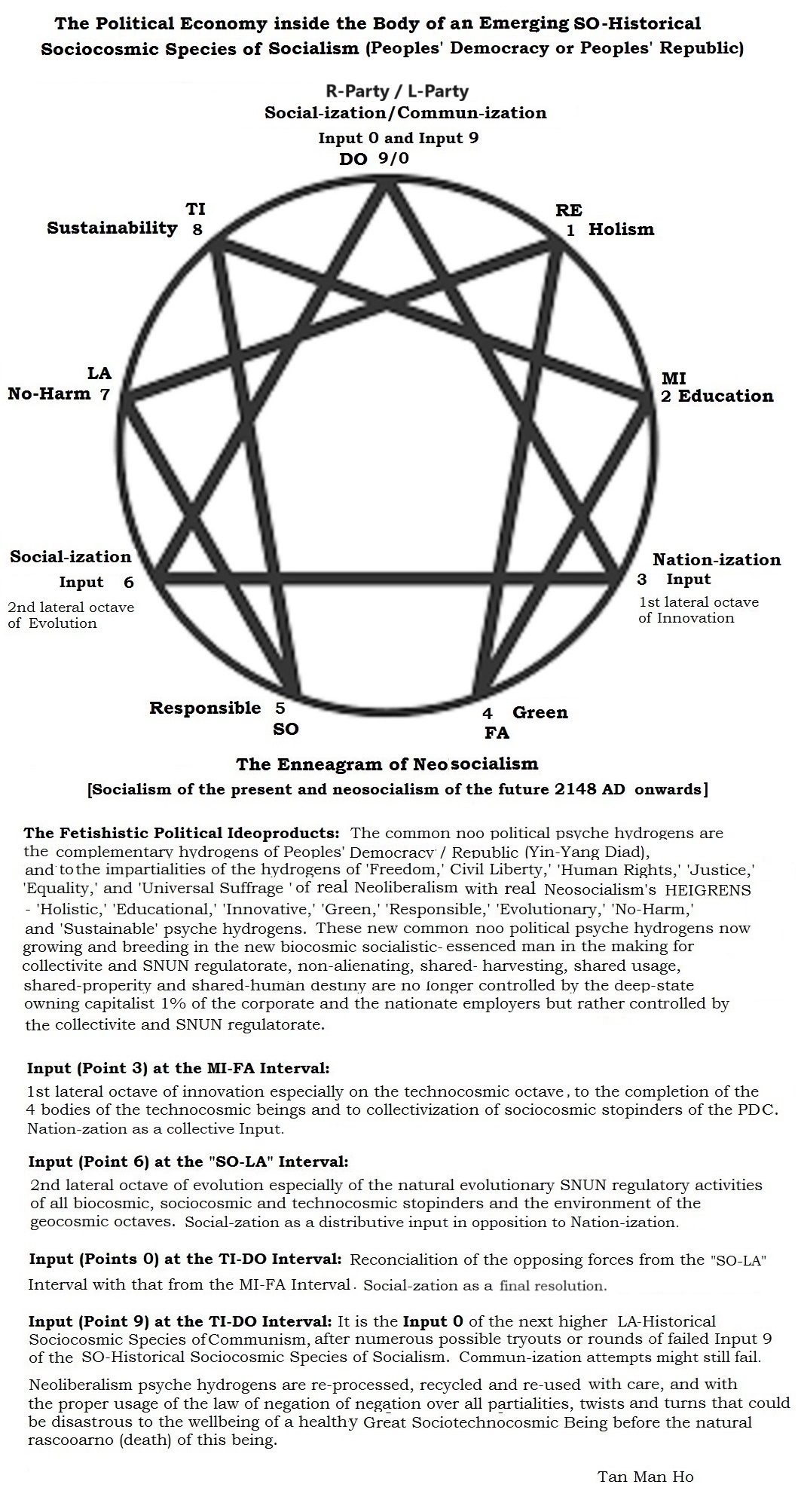 3 So long as capitalism, colonialism, imperialism, fascism, Nazism and Hegemonism with their capitalistic-essenced exploitation, limitless individualistic private wealth accumulation and owning on limited geo-resources, labor-resources, robot-labor resources, commodities, financial capital and services and war-mongering by the minority class exists in our society, Marxism-Leninism-Maoism cannot disappear or made to disappear by whatever means as they are negators of these unbecoming elements from a shared-prosperity Sociocosmic Will at the TI-DO Interval against this non-sharing predatory nature and highly individualized and privatized ownership aberration in the MI-FA Interval. The two opposing essences of capitalism and socialism are united trialectically and always reciprocally changing the essences of one another in history in this polar FA-SO-LA-TI Historical Periods of Capitalism and Socialism (1788 AD - 2148 AD). Both the law of reciprocal destruction essenced to corporate (a Fa-stopinder) capitalism and nationate (a La-stopinder) colonialism and imperialism and the law of reciprocal nourishment essenced to cooperative (a Fa-stopinder) socialism and socionate (La-stopinder) collectivism would stopinderate from the 6th level sociocosmic stopinder (Nation-level, LA) to the ultimate 7th level sociocosmic stopinder ('World-of-Nations'-level, TI). This is the highest level (TI) of an empire mandatory and without exception in its extraction, exploitation and oppression quest in the trioctave dynamics of the sociocosmic octave! New layman's words of beautification of the hungry devils' invisible hands of the multiautofeeding markets of exchanges, the visible arm-twisting hands of production operation, the tracker hands of distribution together with the professional's professional jargon for psychological conditioning peculiar to this polar FA-SO-LA-TI aberration have always been endlessly invented in the psychological spaces of Humanity-at-Large during this 4th Marxian historical period. But the hidden opposing essences of capitalism and socialism cannot be removed within this period. The sociocosmic shock absorbers at the MI-FA Interval, corporate and nationate laujinggongs, that give rise to three main classes (bourgeoisie at the top and the proletariat at the bottom and a 'petty-bourgeois-lumpen-proletariate' in the middle) each main class is capable of further divided into an inner sub-classes of threes in the body of the FA-Historical Socicocosmic Species of Capitalism. Now in the cloak of governmental polities under this unavoidable class struggles, one would witness extreme dictatorships, namely, the Dictatorship of the Bourgeoisie versus the Dictatorship of the Proletariat industrial-inclined revolution of the antagonistic class struggles, and an in-between industrial-inclined evolution of the non-antagonistic class struggles of the PDCE substructure in the form of the always problematic 'vote-partialities' with the severe dysfunctional disease of 'select-partialities' of maleficence caused by their perpetual wiseacarings and much kunderbuffered views and partialities of interests in perpetual conflict and fragmentation easy for 'divide and rule' and as good food the powerful hegemon in the PESTLES(+) superstructure ....... until the final decline or death of this FA-Historical Sociocosmic Species of Capitalism or the DASEIN (Martin Heidegger) of this FA-Historical Sociocosmic Species of Capitalism dies by its own sociocosmic rascooarnooian negation and transforms into the DASEIN of the new SO-Historical Sociocosmic Species of Socialism which is a comprehensive whole-process 'peoples' democracy-peoples' republic' in DASEIN balance with all-stopindered beings included without partialities or missing interests and the dreadful pyramidal 1:99 of Wall Street. While proletarian revolutions of the MI-FA Interval should convert the regulatory stopinders of the TI-DO Interval of Industrial capitalism into socialistic- essenced regulatorates, it however, did not occur for the proletarian revolution cannot be confined to just within a state, a nation or a nation-bloc, and thus bourgeois colonialism, Imperialism and fascism happened globally taking the lead instead. This led to many wars of independence but after achieving their independence could only produce capitalistic-essenced states and nations, and even nation-blocs except for some sociocosmically trioctave-ascended states, nations and nationblocs such as the USSR and other socialistic-essenced nations. Then Industrial capitalism undergoes a 3rd metamorphosis into Financial capitalism for the capitalistic-essenced states, nations and nationblocs of the Westphalian sphere gaining much financial power, enabling neoliberal revolutions, color revolutions, privatization revolutions and shock therapies to destroy non-Westphalian sphere, and in order to continue to extract, exploit and maintain the position of hegemony of UGGMBCC (1%) Wall Street (and deep-state in US). The UGGMBCC that arise after the 4th metamorphosis of Hegemony capitalism needs to feed on the socialistic-essenced and the capitalistic-essenced spheres through the MI-FA Interval corporate and now boldly direct unilaterally through the TI-DO Interval nationates itself merely for the purpose of subjugating and/or destroying their respective MI-FA Interval enemy corporates and TI-DO Interval disobedient enemy regulatorates. For the socialistic-essenced sphere, the purpose is to destroy their socialistic (collective) essence in favor of individualistic (private) essence to an octave-descended restoration level again of the newly defeated obedient enslaved states, nations, and even of nationblocs (Global South countries) subservient to Hegemony capitalism of the Anglo-American US Hegemon and the Global North countries. The Finance capitalism and Hegemony capitalism witnessed severe de-industrialization of this dirty Horse Body No. 2 in the Western sphere with "enforced" indust