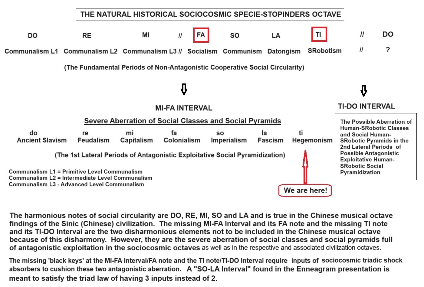 "Along the MAINSTREAM Fundamental Natural Historical Sociocosmic Specie-Stopinders Octave, Primitive Communalism (Intermediate and Advanced inclusive) is born as natural but unnamed Westphalian "FLJRES-DR" fixates (Freedom, Liberty, Justice, Rights, Equality and even Suffrage - Democracy-Republic) as it is naturally Social Circularity structured with subconscious noomakhian Light at the lowest level and Communism and Datongism is a return, revised and learned improved and conditioned till stabilized as Advanced Social Circularity structured with conscious noomakhian Light at the highest level and would be naturally an FLJRES-DR fixates proper truly REAL at the essential core (and certainly NOT Pseudo and peripheral as it has been in the past in the Westphalian MI-FA Interval ABYSS). In the MI-FA Interval ABYSS (the 1st Shock of the lateral octave) of this same Fundamental Natural Historical Sociocosmic Specie-Stopinders Octave, where Ancient Slavism, Feudalism (Medieval and Renaissance), Capitalism (Colonialism, Imperialism, Fascism, Nazism, Militarism and Hegemonism inclusive) are posited with Social Pyramidization structured (Right Standing Social Pyramids) born ill-fatedly and with the malevolent noomakhian Dark full of pseudo FLJRES-DR fixates - a real terror-of-the-situation. Socialism being a transition society is inverted Social Pyramidization structured (Inverted Social Pyramids) always posited at the nodal line and beyond at higher level. In the MI-FA Interval ABYSS, the Right Standing Pyramids-Inverted Social Pyramids conversion happened many times each time with the renaming of ancient slavistic kingdoms, feudalistic dynasties, imperial-dynasties, Westphalian states and nations across millennia and in accordance to the law of transition of the quantitative changes into qualitative change and vice-versa, and the law of negation of negation." The nodal point where right-standing capitalistic-colonialistic-imperialistic-essenced, exploitative and oppressive social pyramids of the laujinggong carriages of the Historical Sociocosmic Species of Capitalism in severe antagonistic polar FA-SO-LA-TI contradiction with the emerging inverted socialistic-essenced, non-exploitative and non-oppressive social pyramids of the gongjingdong carriages of the Historical Sociocosmic Species of Socialism may be considered an Armageddon Point for Earth civilization because the law of reciprocal destruction has reached the destruction level approaching 10^10 Megawatts in the Kardashev Scale of Civilization Type I; however, the law of reciprocal nourishment has also reached the constructive level approaching the 10^10 Megawatts in the same Kardashev scale; and the destruction-construction has also reached the seventh level, 'TI' at this Armageddon Point in a probability of 50-50 of a full spectrum nuclear war world wide. Nay more, according to the law of three, there is also a law of reciprocal feeding that lurks in between as the obscure and obfuscating third law. The Anglo-American (Western) civilizational TI-laujinggong carriages (G7) of the FA-Historical Sociocosmic Species of Capitalism, its hegemony and empire is now collapsing and in its place the Sinic (Chinese) civilizational TI-Dongjinggong carriages (BRICS+) of the SO-Historical Sociocosmic Species of Socialism, its leading role amongst the multipolar nations is now rising and favored. Capitalistic-essenced colonialism and imperialism begets capitalistic-essenced empire; disguised capitalism behind socialism leads to failed socialism with social colonialism and social imperialism and begets pseudo-socialistic-essenced empire and would still collapse like the USSR Empire. A proper and normal SO-Historical Sociocosmic Species of Socialism would have no empire in its essence! The arising and emergence of the SO-Historical Sociocosmic Species of Socialism to be the main sociocosmic gravity-center vibration at the 7th level (TI) platform along a sociocosmic octave is no simple as there is a MI-FA Interval for this Fundamental Natural Historical Sociocosmic Specie-Stopinders Octave, where the forces of Hegemonism (ti) and its past deeply buried building blocs hidden within such as its sociocosmic specie-genetic coded Fascism (la), Imperialism (so), colonialism (fa), capitalism (mi), and also feudalism (re) and ancient slavism (do) forms a formidable power of retardation/deceleration or resistance for the leap out of this MI-FA Interval of antagonistic exploitative social pyramidization fully under the active law of reciprocal destruction. In this understanding, the SO-Historical Sociocosmic Species of Socialism, being a rising and emerging sociocosmic stopinder being, needs to manage the declining powerful forces of retardation under the law of reciprocal destruction and the emerging also powerful or even more powerful forces of acceleration needed under the law of reciprocal nourishment to synthesize the various infantile SO-Historical Sociocosmic Species of Socialism, and feeding, caring and protecting them until they become independent socialistic-essenced nation-stopinders with real sovereignty free from the mystical spell and the deadly grip of capitalistic-essenced hegemonism and its supporters. While capitalism has stopinderated innerly through capitalistic-essenced colonialism, imperialism, fascism and finally, Hegemonism, feudalism too has innerly stopinderated in similar feudalistic-essenced colonialism, imperialism, fascism and hegemonism but more on a regional scale. As to ancient slavism and modern slavism, its slavery-essenced is more of conquering and capturing people from other countries, native civilizations and turning them into slaves, their vassals, colonies, territories, sovereignties and other properties were traded in the ancient slavery market, and in the modern slavery market of the 19th and 20th centuries through agreements of the lateral corporate stopinder beings of the MI-FA Interval and through treaties of the lateral