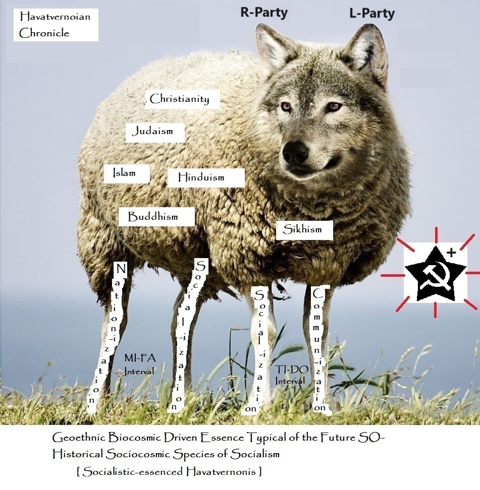 Picture description: Also found in the FA-Historical Sociocosmic Species of Capitalism but an infantile not strong to fight without protection and is the socialistic essence mostly found in the SO-Historical Sociocosmic Species of Socialism. The two right (Social-ization) and left (Commun-ization) front legs of this neosocialism wolfhead sheep represent the two peculiar unsuspecting rather "invisible" respective descending and ascending economic vectors at the TI-DO Interval of the future SO-Historical Sociocosmic Species of Socialism. The two right (Nation-ization) and left (Social-ization) hind legs represent the two respective descending and ascending economic vectors of the MI-FA Interval and related socialistic-essenced governmental policies from the lateral LA-stopinder of the socialistic economic system and show the descending and the ascending 2nd lateral octaves in the TI-DO Interval. The sheep with wolfhead is the guardian of a real political FLRJES-DR narratives or ideologies - real freedom, real civil liberty, real human rights, real justice, real equality and real universal suffrage - to prevent deceiving the people. Fixated gravity-centers of neosocialism enneagram of an emerging infantile SO-Historical Sociocosmic Species of Socialism is depicted in the picture below: Note: 1. Nation-ization is a MI-FA Interval process of state or national ownership and decision-making of the means of production-distribution-consumption-exchange under regulatory governmental policy of the SNUN Regulatorates (Socionates) at the TI-DO Interval that is associated with local, state and nation advanced-level futuristic Collectivites (Cooperatives). 2. Social-ization is a "SO-LA Interval" process also of state and national ownership and decision-making of the means of production-distribution-consumption-exchange under regulatory government policy of the SNUN Regulatorates at the TI-DO Interval that is associated with de-nation-ization but rather giving to the Public-at-Large or all the 7 fundamental and 2 x 7 = 14 lateral stopinders. 3. Social-ization at Point 9 is a stopinder fixating to all the the Public-at-Large as an excuse to make every resolution or synthesis of contradictions between nation-ization and social-ization under and fixated to 'Social-ization' as the ultimate masking-platform for which the power and decision remains socialistic and democratic at workplace with a permanent aberration of needing to correct and adjust GINI Coefficient. 4. Commun-ization at Point '0' of the next higher sociocosmic octave is very futuristic and mostly a utopia about possible common ownership of the means of production-distribution-consumption-exchange entities and decision-making democratic naturalized transfer to common prosperity to each and every 7 fundamental stopinders and the 2 x 7 = 14 lateral stopinders when the body of Common-at-Large or Humanity-at-Large is still trapped in the SO-Historical Sociocosmic Species of Socialism. But pseudo-neosocialism is the actual consequences under predatory, exploitative and profit-seeking in contemporary capitalism, as depicted in the picture below: This type of learned pseudo-neosocialism wolf-in-sheepskin beings, having also eaten up their own neosocialistic sheep, now use this neosocialistic sheepskin as cover and camouflage to eat the sheep of other states and nations. Capitalistic, imperialistic and neocolonialistic essence peculiar to the FA-Historical Sociocosmic Species of Capitalism goes rampant to further a full spectrum World-Island extraction, exploitation and oppression as it should be and as always has been written in its fixated pseudo HEIGRENS socio-genetic code. Anglo-Saxon Geoethnic Biocosmic Driven Essence sheep-skin wolves of Western Anglo-Saxon origin and their subspecies mutants, big and small are aplenty roaming about in packs on Mother Earth's surface in search of prey during the polar FA-SO-LA-TI Historical Periods of Feudalism and Capitalism (1 AD - 1788 AD) and the polar FA-SO-LA-TI Historical Periods of Capitalism and Socialism (1788 AD - 2148 AD) for which their intensity and global reach has become the greatest and the highest as the gravity-centers of sociocosmic vibration ascended to LA and TI. The MI-FA Interval of our Historical Sociocosmic Octaves or Civilization Octaves between 'MI' and 'FA' needs special input to allow the ascending forces to move forward. This input is the 1st Lateral Historical Technocosmic Octave for the MI-FA Interval between the MI-Historical Socociocosmic Species of Feudalism or Feudal Civilization and the FA-Historical Sociocosmic Species of Capitalism or the Capital Civilization. Note that, there would be another input at the TI-DO Interval between the TI-Historical Sociotechnocosmic Species of Datongism and the DO-Historical Sociotechnocosmic Species of SRobotism (Spiritual Robotism). This input would be the 2nd Lateral Historical Spiritual Sociotechnocosmic Octave. Political-enabling stopinders of these fixated enneagrams of neoliberalism, pseudo-neosocialism, neo-religionism of post feudalism, the New Age Movements and the current LGBTQIA(+) elements (Lesbian, Gay, Bisexual, Transgender, Queer/Questioning, Intersex, Asexual and Plus fixated enneagramic stopinders) which are deviations or aberrations from the normal trialectics of man and woman, are all of social, political, biological, economical and cultural devices, each with 9 gravity-centers of psyche hydrogens collectively identified and enneagram-welded as enneagram of neoliberal fixates on the one hand and as enneagram of pseudo-neosocialism fixates. Because it is a fixated enneagram, it is not natural or geoethnic or socio-genetically or involutional or evolutional, it is more of implantation - surgical removal and installation of obedient heads of states and nations through social engineering done mostly by the powerful hegemon Goliath nation onto other David states and nations to keep them as modern slave states and nations always