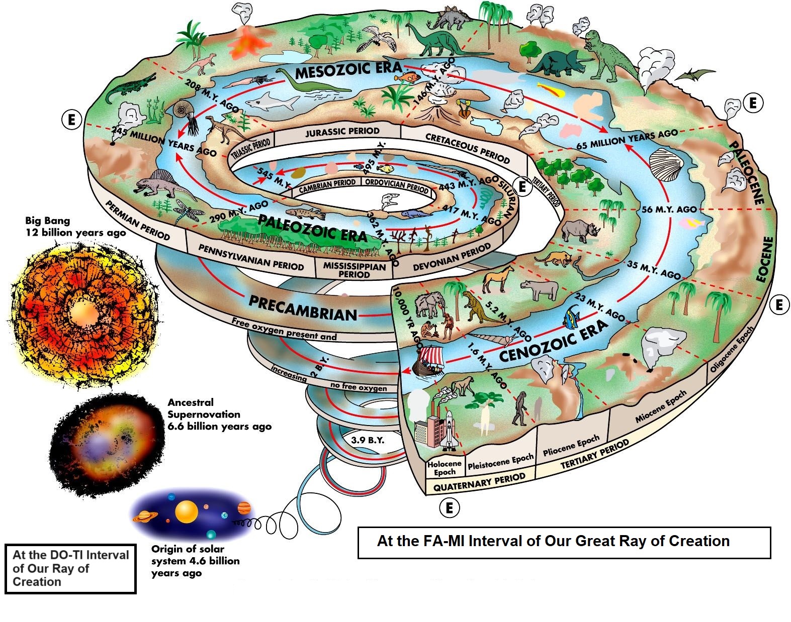 The Paleozoic Era (Paleozoic means ancient life) which began 520 million Earth years ago.  The climate on the gas octave of being-Earth was mostly very mild.  There were few protruding solid matter or mountains and the liquid octave was contained in wide shallow ‘seas’ on those solid formations known as continents.  And this remarkable thinker divided this Era into seven periods based on a principle known as ‘intervals of mountain building’.  Thus the RE-Historical Biocosmic Octave separated into seven inner octaves or time-based periods whereby various kinds of emerging biocosmic beings are evolved to further balance the perturbation at the cosmic retardation point.  And these seven periods are: