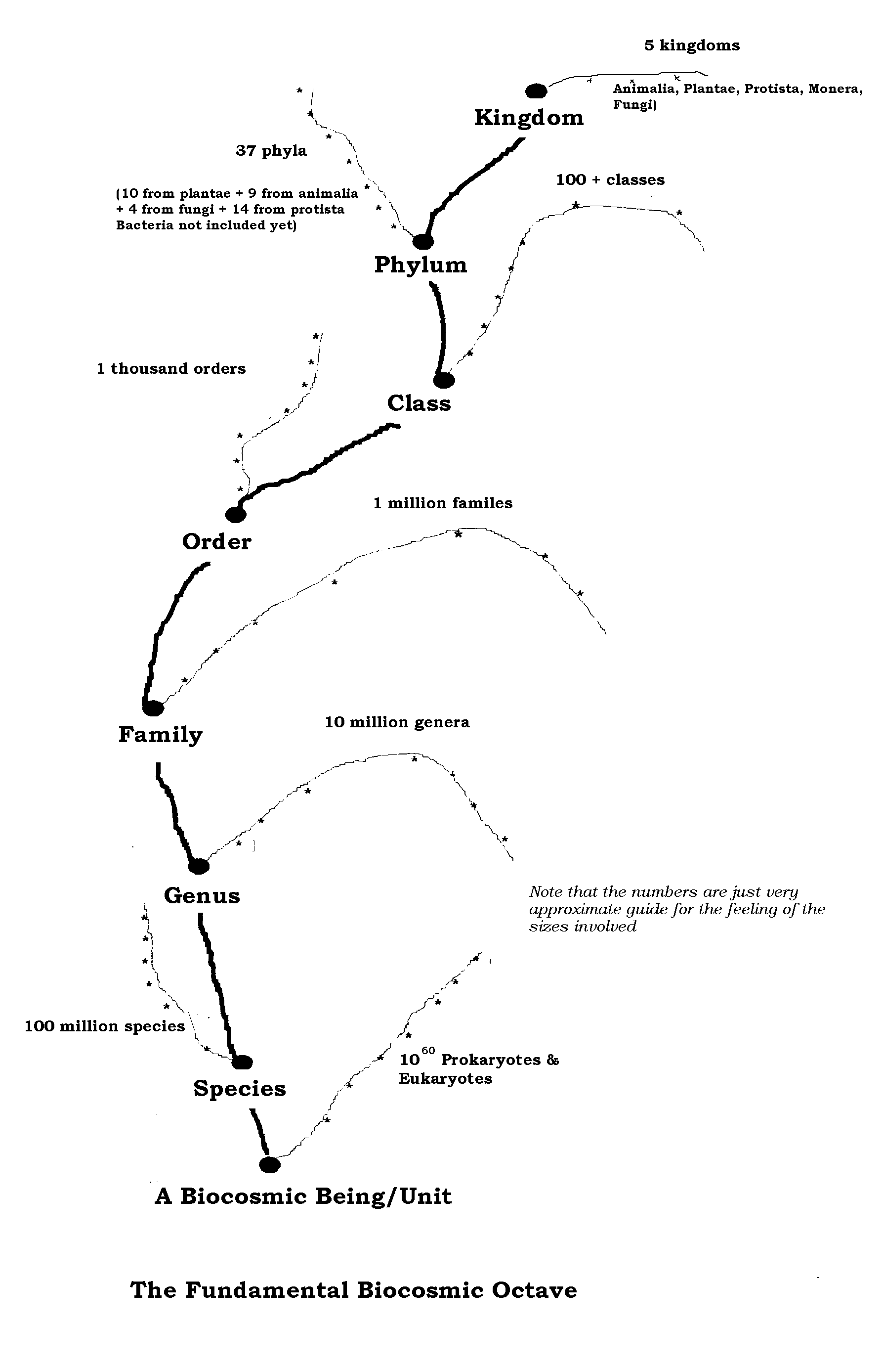 The essence of such externally perceived taxonomy is the essence of the octave energy that give rise to this periodicity – the expression of the functioning of the Great Ray of Biocosmic Creation in the formation of the organic film the film that will provide the food of life energies to the Our Solar System. Paleontological Trees and our taxonomical classification both are results of observation of some hidden energies and forces working behind the expressions of matter. The energies and forces are again behaving according to laws, and two such laws are the law of triad and the law of octave.